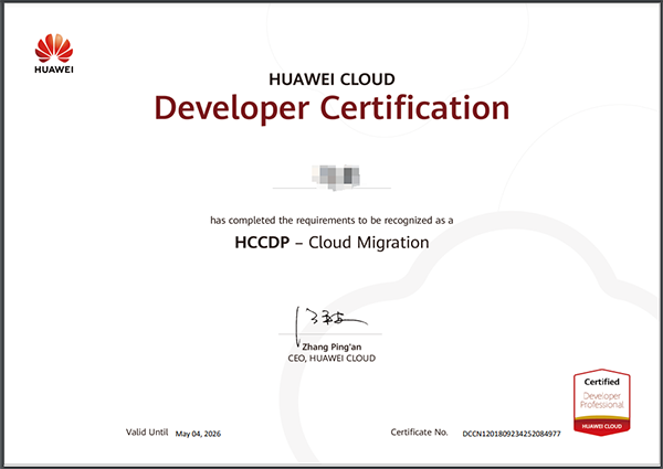 经过培训赋能和考试认证,Topay钱包科技技术华为云事业部已有18人获取华为云开发者-云迁移HCDDP-Cloud Migration证书。